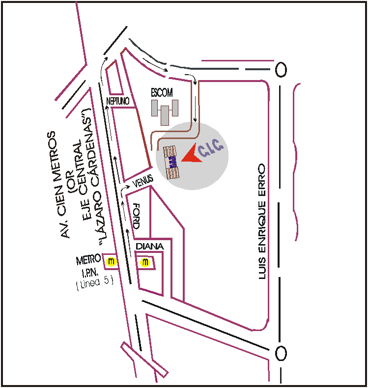 "Vaya al Norte por Eje Central Cien Metros hasta el Metro Politécnico, páselo, pase un edificio mas (tienda de automóviles seminuevos Ford Mylsa), dé vuelta a la derecha (por la calle Venus), entre en el territorio del IPN (Instituto Politécnico Nacional), vaya al edificio roso de 3 pisos."